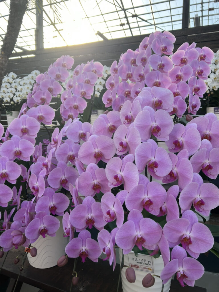 華やかなピンクの大輪胡蝶蘭がたくさん並んでいます。